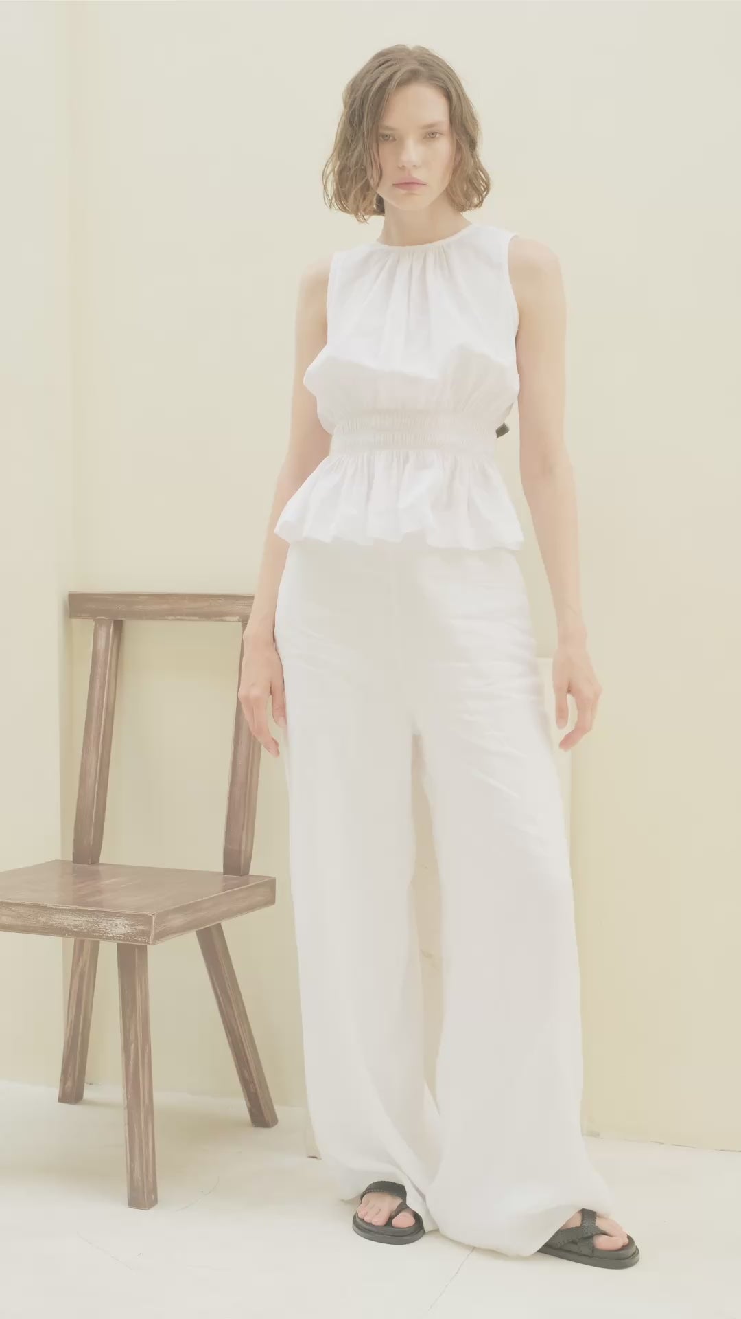 The Daydream Top in white is made of soft cotton and features a high round neckline with central gathers. The neck and armholes are bound for a polished look, while the back has a keyhole with a tie closure. The waist is cinched with shirring details and the hem is gathered off the shirring, finishing at the high hip. This top is perfect for adding some flair and comfort to your wardrobe!