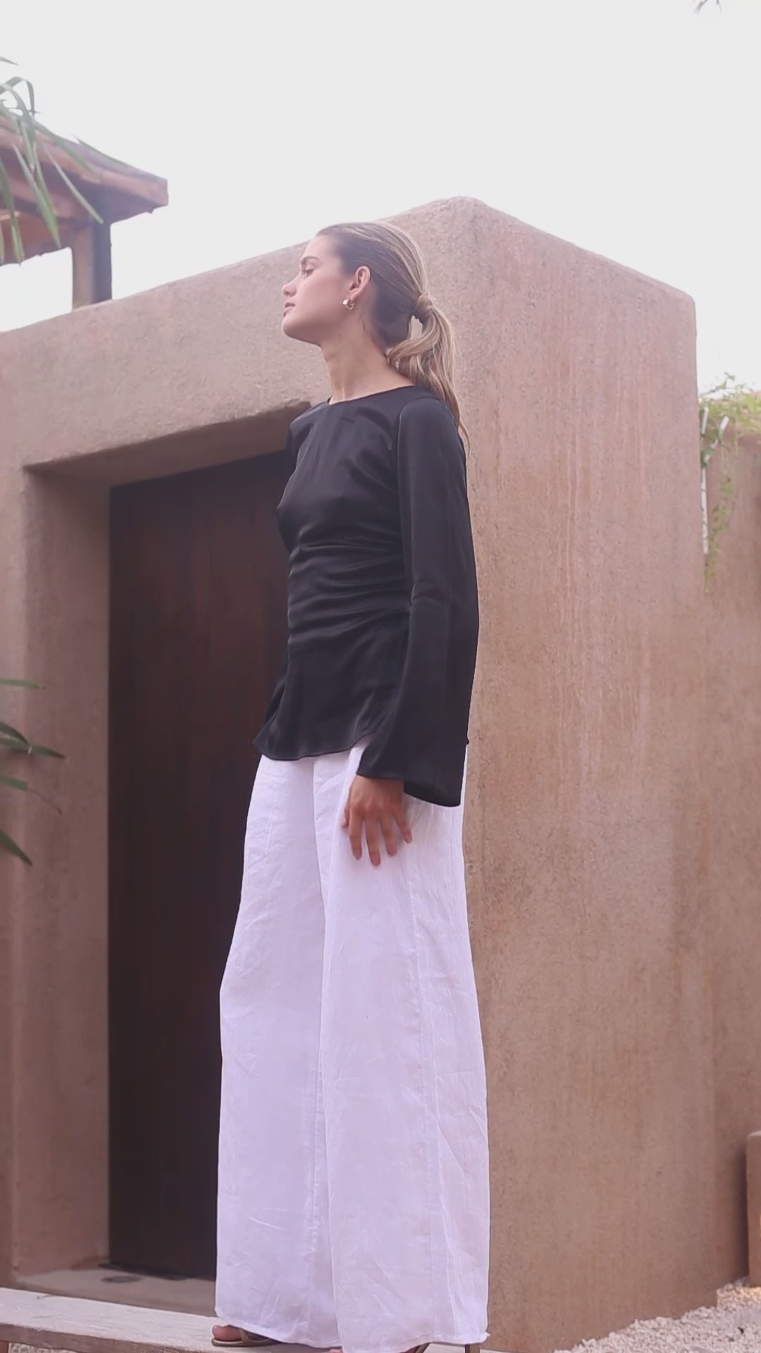 Crafted from luxuriously silky viscose and featuring a high round neckline and long flared sleeves, this black Darling Top exudes elegance. Its low back is adorned with an open back and adjustable bow tie, while the lower back frill boasts an elasticated top edge for a flattering fit.