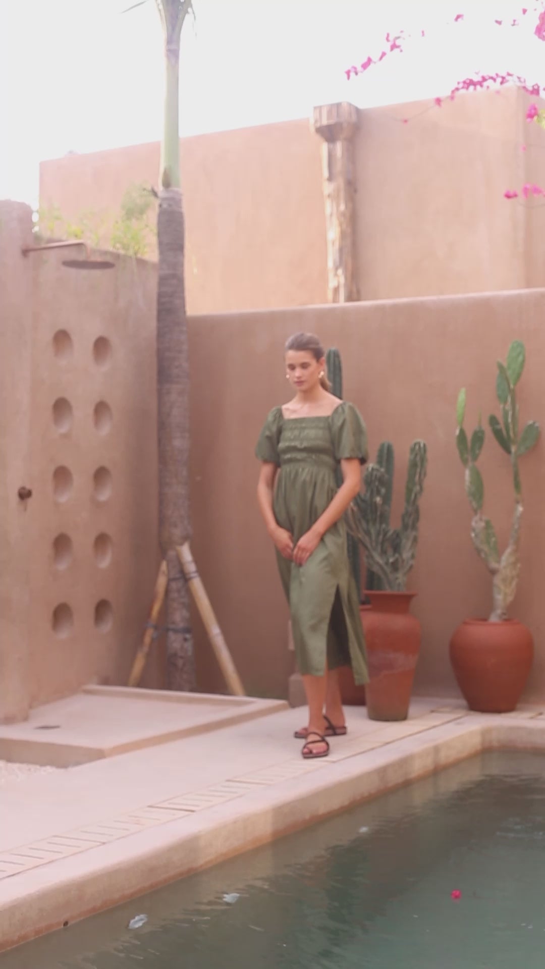 Crafted from luxurious cotton satin, this dress is adorned with exquisite details. Featuring a square neckline, delicate shirring on the bodice, and short puff sleeves, it exudes elegance and sophistication. The open back with lacing adds a touch of allure, while the gathered skirt and side splits create a graceful silhouette. In a midi length, it is the epitome of tasteful refinement.