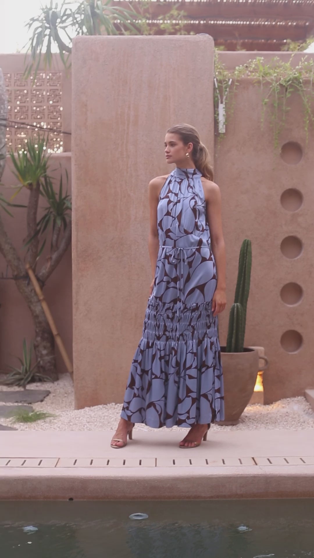 Indulge in the exquisite allure of our viscose high shine satin Lady Love Dress in the stunning coco/blue floral print. It features a halter tie neckline, slight gathers from the neck, and a back neck slit with a button closure. The bust is gathered off an angled under-bust seam, with shirring details on the thigh. It flows into a sweeping maxi length with side splits to the knee, exuding elegance and sophistication.