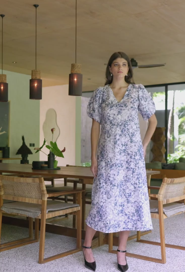 Indulge in the exquisite beauty of the Limited Edition Blue/White Floral Vallis Dress. Designed with a flattering v-neck and a relaxed fit, this dress features short puff sleeves and side splits for added charm. Made with luxurious linen, it exudes a chic and comfortable vibe, while the midi length adds a touch of elegance.