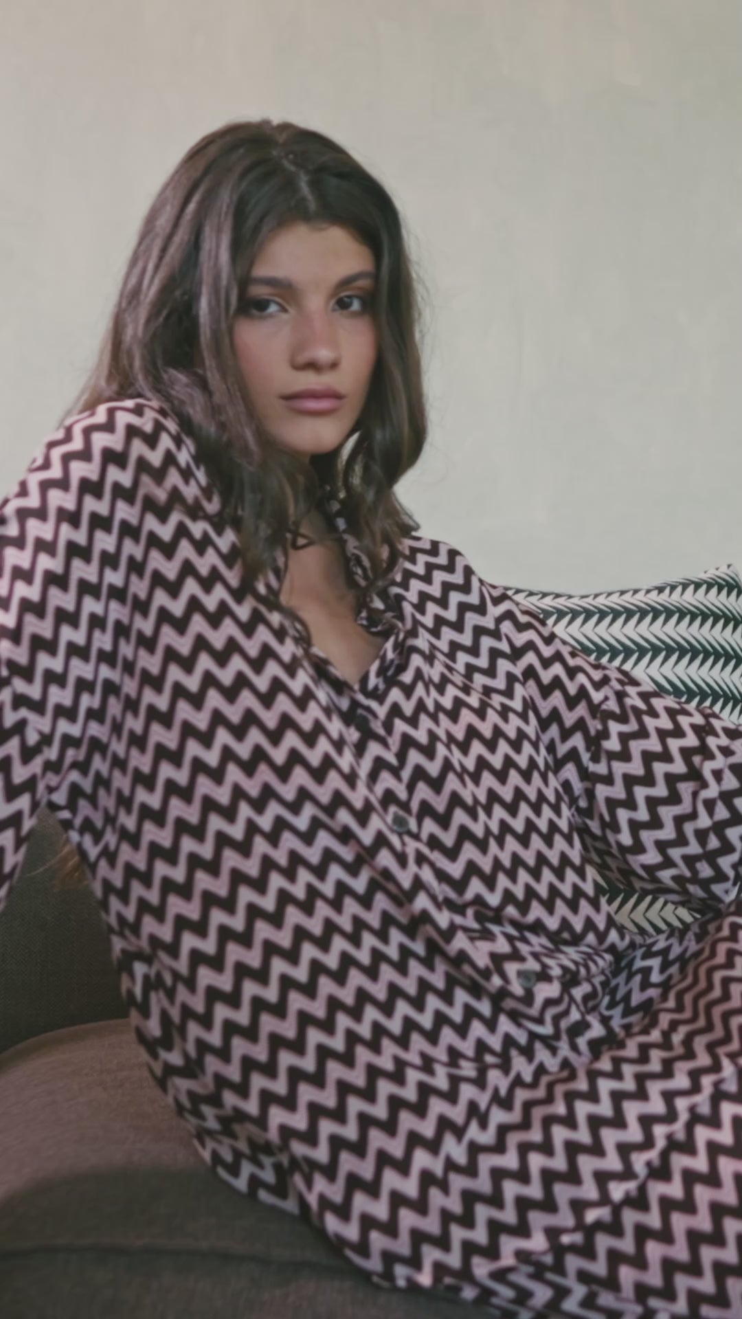 Indulge in the luxurious feel of our silk crepe Saturday Skirt, featuring a bold and playful chocolate/ivory/pink zig zag print. Made with a flattering bias cut, this ankle-length skirt is a must-have for any fashion-forward wardrobe.