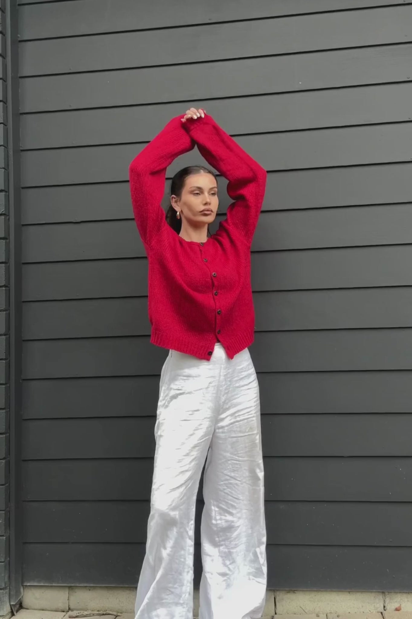 Get cozy and stylish with our Teddy Cardi in red! Made with soft and durable faux mohair yarn (100% acrylic), this relaxed fit knitwear features a round crew neck and a button-through front with contrast black buttons. Dropped shoulders and full length billowed sleeves add a touch of comfort and elegance to this cropped length cardi that finishes just at the high hip.